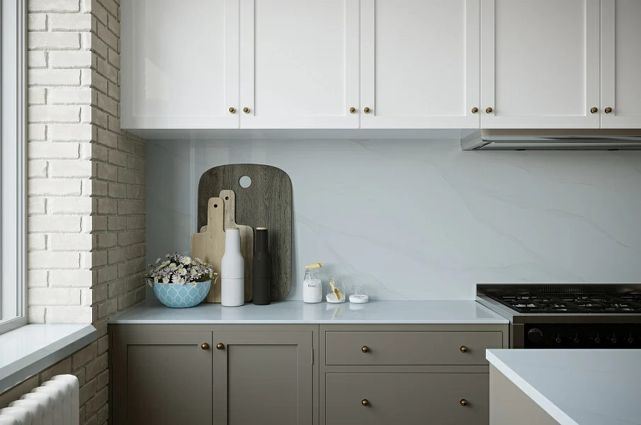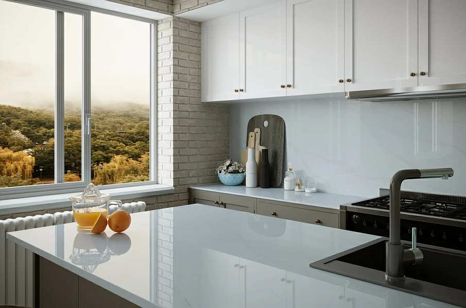 Vicostone Bettoglio BQ-8800 — полированная поверхность с продольной жилой серо-зеленого цвета. Вдохновленный знаменитым итальянским натуральным мрамором Calacatta, Vicostone Bettoglio имеет утонченный и роскошный вид. Выраженные нейтральные светло-серые прожилки гармонично сочетаются с теплым белым фоном.